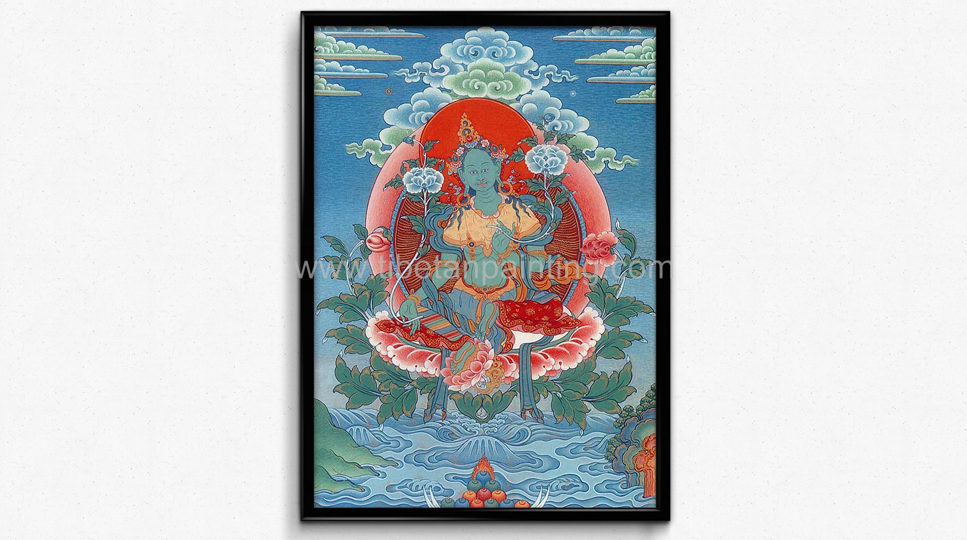Green Tara, the Swift Liberator, is the principal female manifestation of enlightenment in the Buddhist tradition. According to her legend, many eons ago as the Princess Jnanachandra (Wisdom Moon) she devoted herself to the teachings of Buddha Dundubhisvara and made many offerings to that Buddha and his entourage. Eventually, as the result of her untiring practice, she generated the pure, altruistic bodhicitta motivation for the first time and thereby became a bodhisattva. By mastering extremely profound states of meditation she developed great skills in liberating others, and hence her name was changed to : TARA,the Savioress. In paintings and poetry she is often depicted as coming to the immediate aid of those in danger. Tara is often referred to as the One Who Rescues from the Eight Great Fears and is revered as the "Mother of the Buddhas of All Three Times."