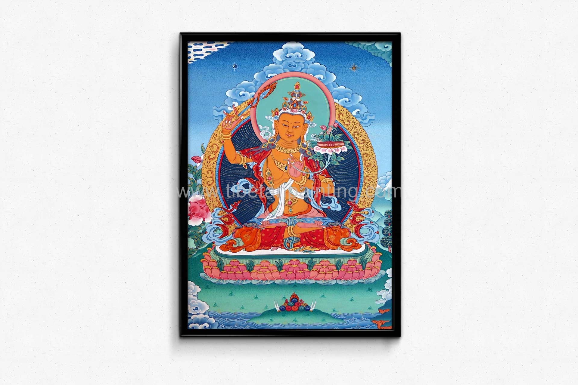 Manjushree is depicted as a male bodhisattva wielding a flaming sword in his right hand, representing the realization of transcendent wisdom which cuts down ignorance and duality.