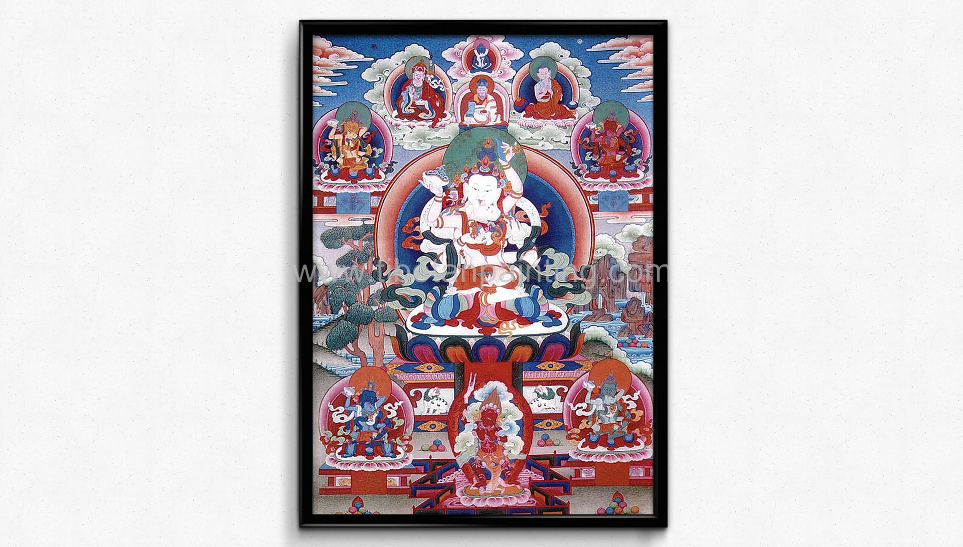 Vajrasattva-The Diamond, or Adamantine Being - is the main deity employed for purification by practitioners of all levels of tantra. Vajrasattva is white in color, signifying his immaculate purity. Like Vajradhara, of whom he is an emanation, he holds a vajra symbolizing method in his right hand and the bell of wisdom in his left. Although, the solo Vajrasattva is sometimes depicted as sitting with his leg partially outstretched, here he is in unshakable vajra posture. Again, Vajrasattva wears the beautiful silken garments and jeweled ornaments of ancient Indian royalty.